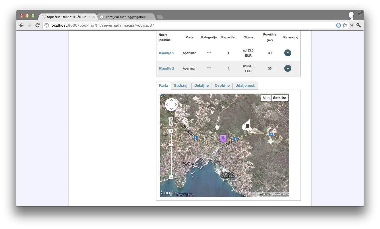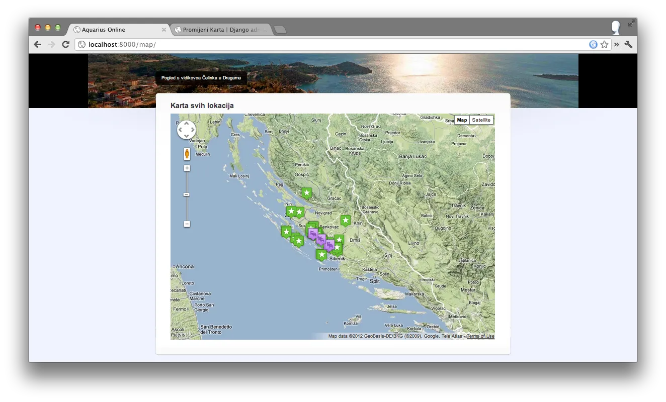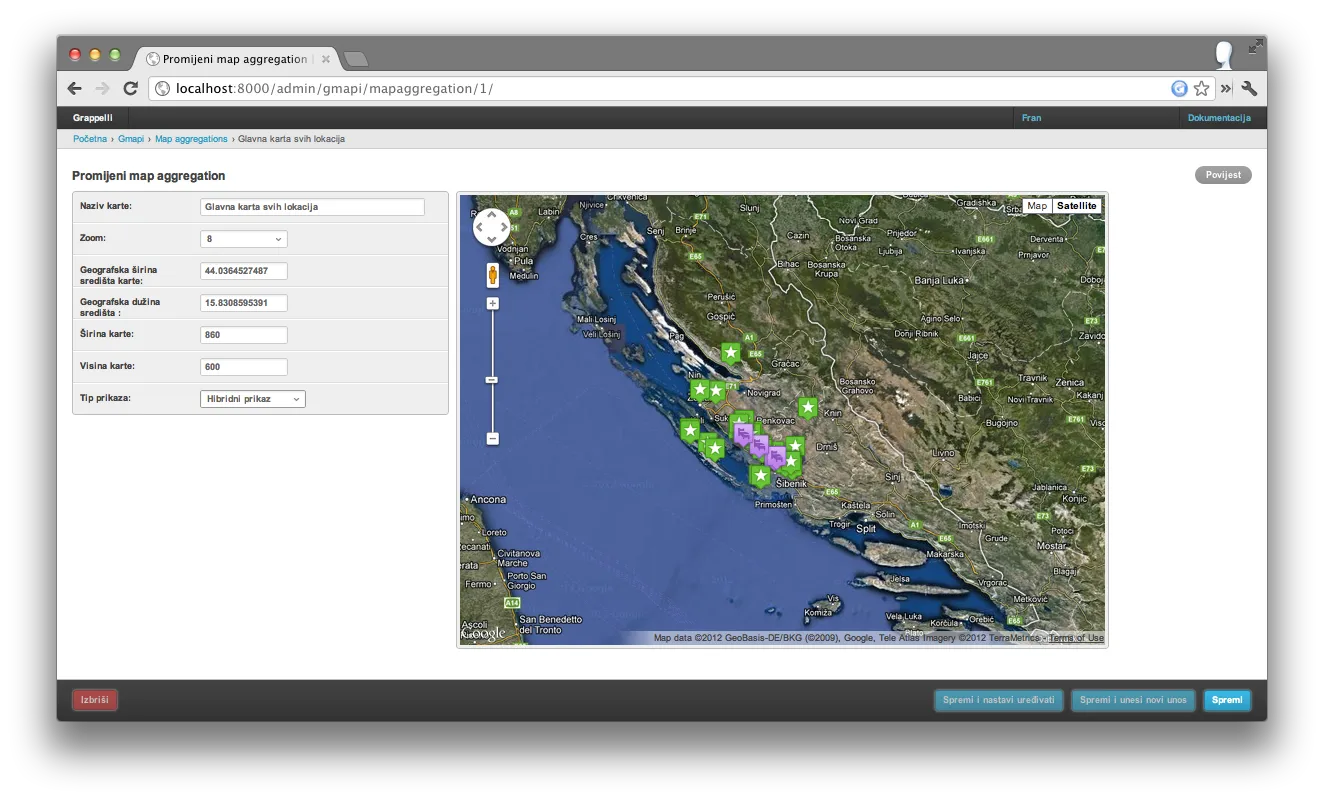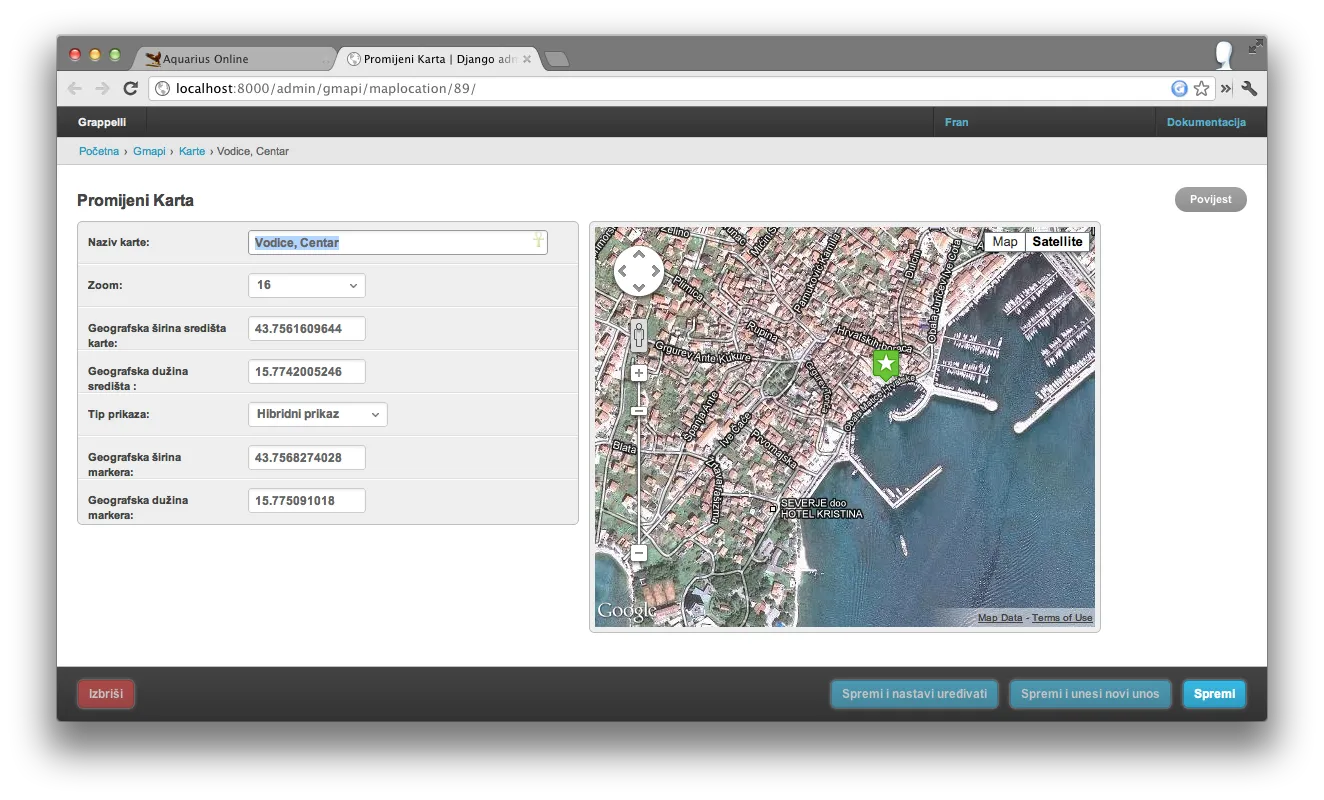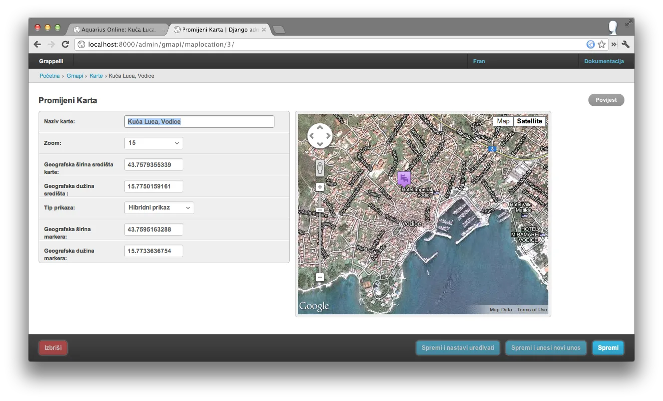 Google maps in Django admin – each map is an object and can be configured separately in the admin. There is a live preview right there in the admin. Configurable properties are: dimensions, marker location, map center location, zoom, map type (satellite, hybrid etc.). Any other attribute could be added if needed.