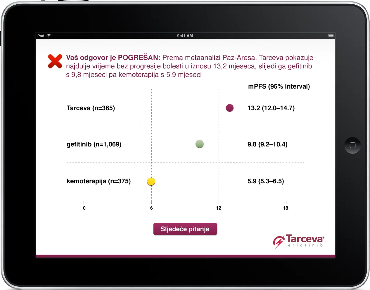 Attending oncologists would pick one of four Roche oncology quizzes and answer clinical knowledge questions about treatment outcomes and study data.