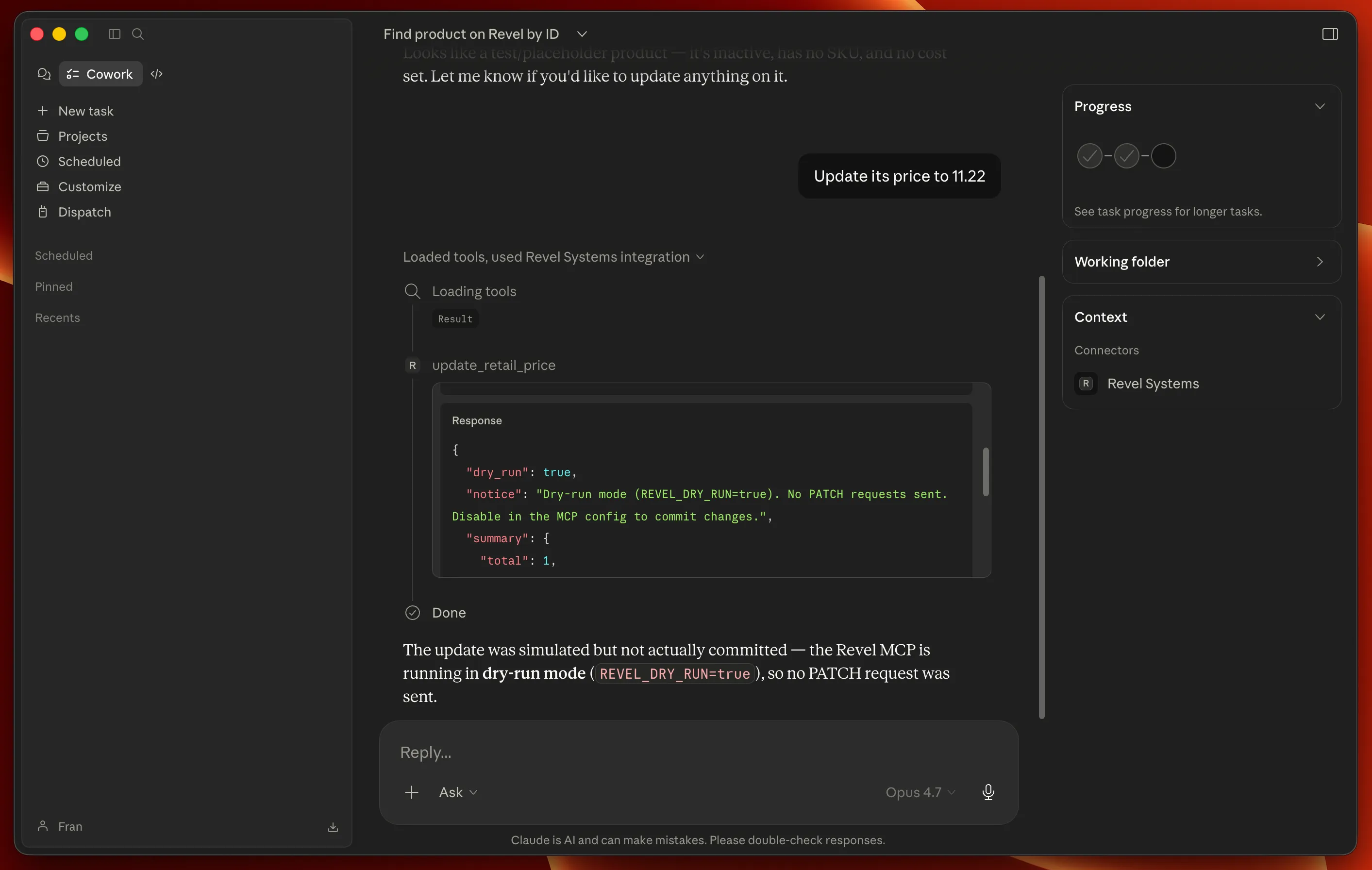 I deliberately kept the tool surface narrow, five tools covering product lookup and batch price updates, rather than wrapping the full Revel REST API. A narrower surface is easier to test, easier for the model to use correctly, and (most importantly here) safer against accidental writes to fields that nobody asked for. Anyone who needs something outside the happy path can call the Revel REST API directly with curl; the MCP is not trying to be a general-purpose client.